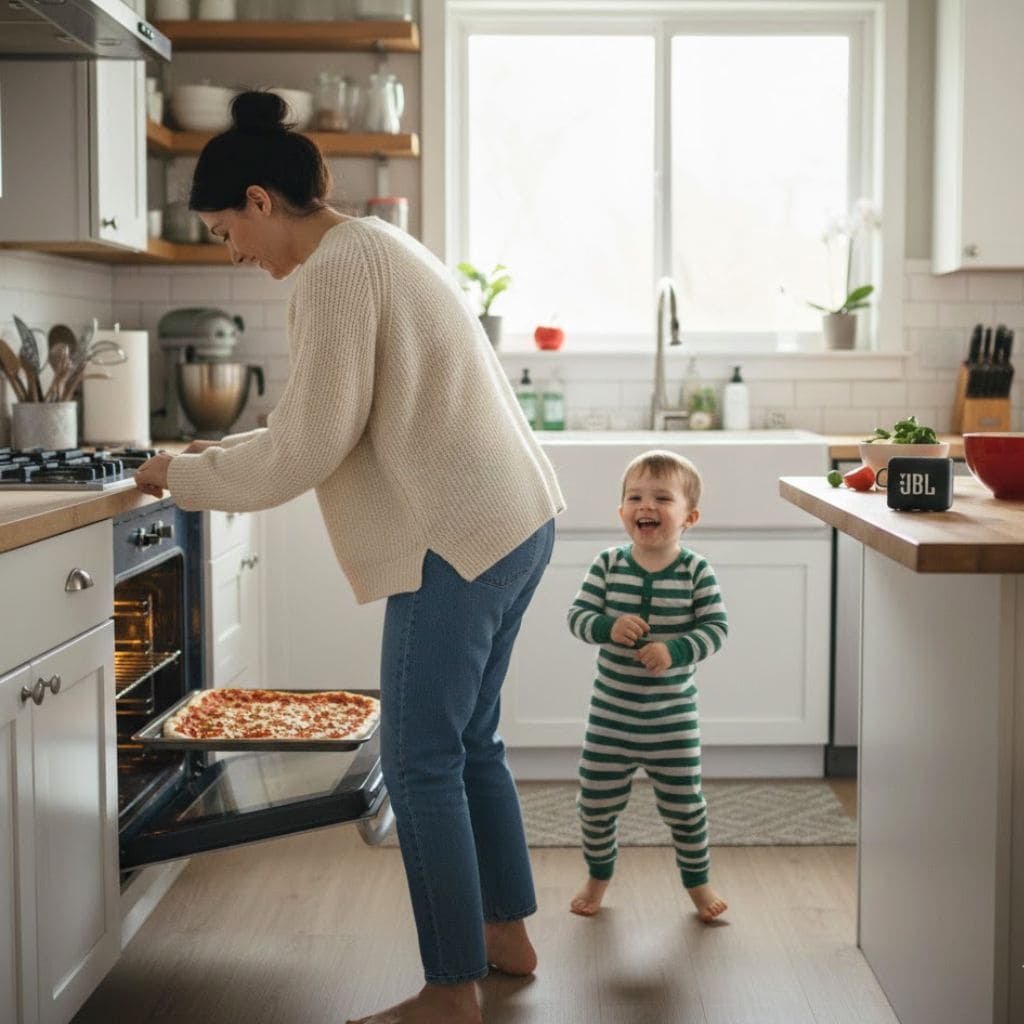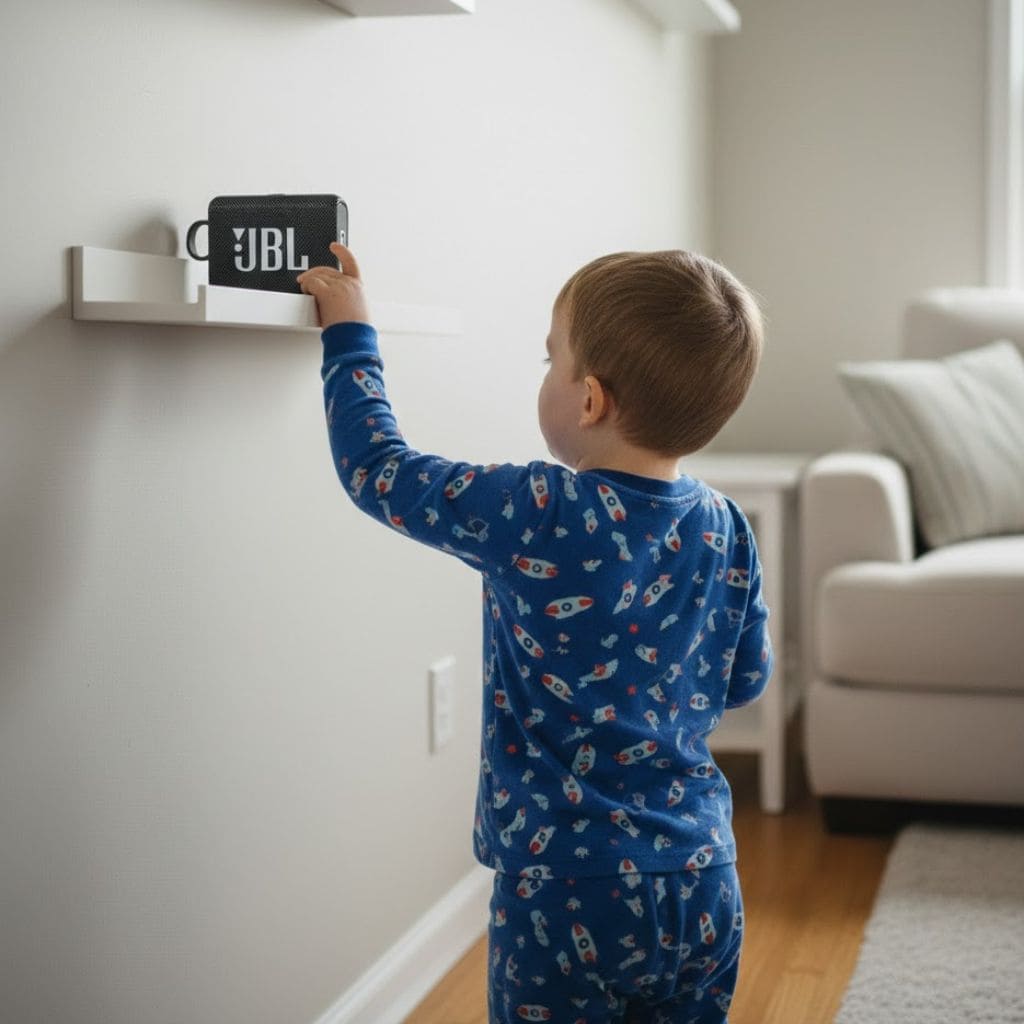 William runs to grab our small black JBL Bluetooth speaker from the living room shelf and sets it carefully on the kitchen counter.